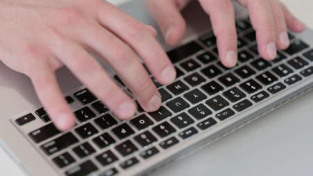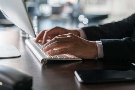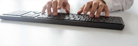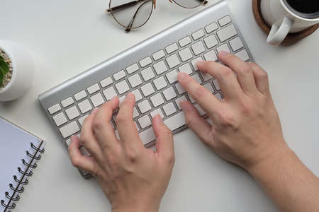 Office manager male hands typing on computer keyboard, closeup. Businessman working, typing on the wireless keyboard, no face, concept of office work