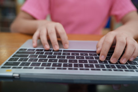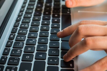 Cropped image of boy's schoolboy's hand typing on laptop keyboard
