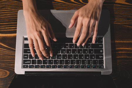 Top view, Female hands typing on notebook laptop keyboard in her comfortable and minimal office desk