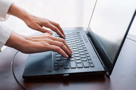 Woman hand typing on keyboard at workplace. Businesswoman working over labtop on a table from wood doing work from home, closeup working hand picture of business communication.