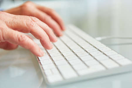 Young woman's hands typing on desktop computer keyboard while working at home.