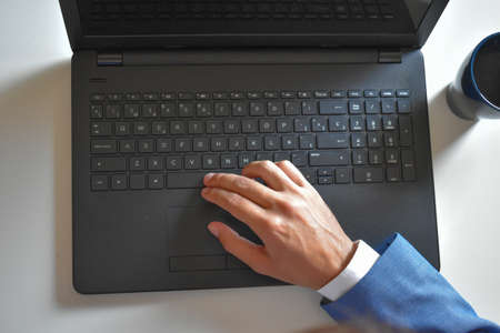 Laptop with a hand while typing or encoding. Business concept, office concept, work from home concepts