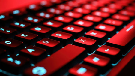 A detailed close-up shot of a modern keyboard with red keys and illuminated blue letters, highlighting the technology and design.