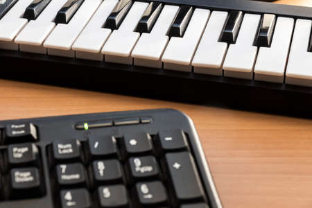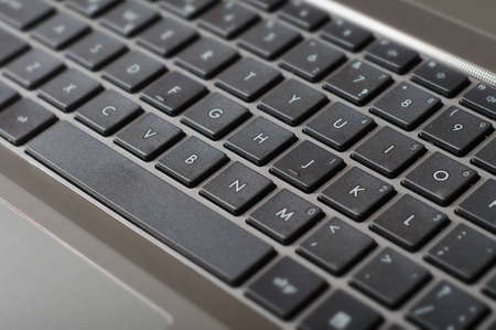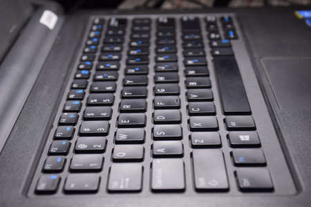 Close up macro image of keys of black computer keyboard on table. White color alphabet letters printed on black large square key for typing. It is an important input device to write word, text, blog.