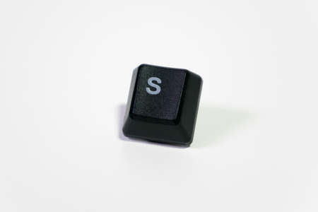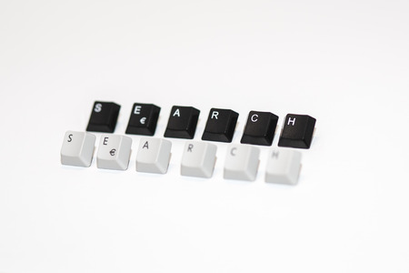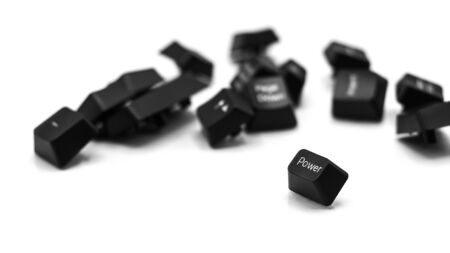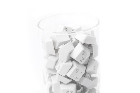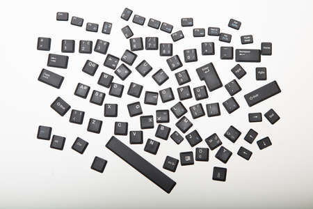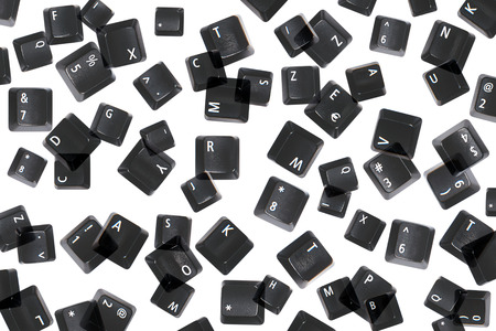 Loose alphanumeric covers for the keys on a computer keyboard in a random jumble on a white or light silver background viewed from overhead centered in the screen with surrounding copy space