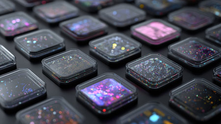 A grid of square-shaped elements, showcasing a spectrum of bright colors including orange, yellow, pink, teal, green, and black. The glossy finish adds depth and dimension to the composition.