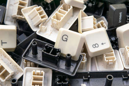 Macro view of a heap of computer keyboard keys. Focus on DELETE key. Computer repair, service.