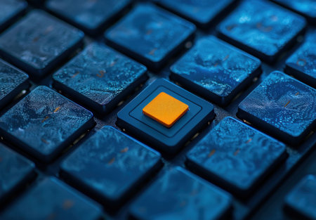 keyboard, technology, close up, bright key, contrasting color A vibrant orange key stands out among dark, textured keyboard keys in a modern, digital aesthetic, emphasizing innovation