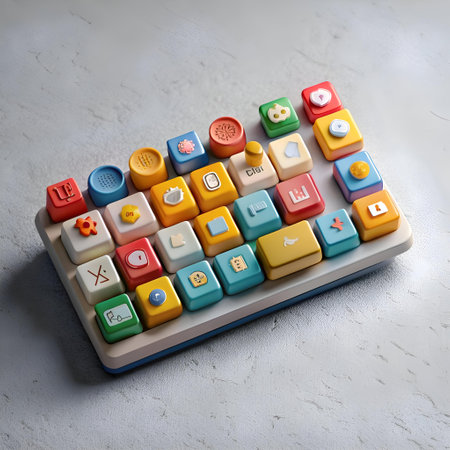 A colorful and playful keyboard with rounded keys featuring various icons. Perfect for presentations. tech blogs. and social media posts about user interfaces. design. and technology.