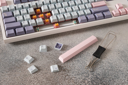 Concept cleaning keyboard. Mechanical keyboard with pastel keycaps on gray desk. Service. Changing, and cleaning buttons. Close up.