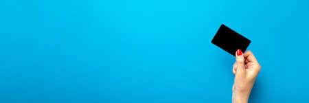 A woman is holding a black discount card on a blue background. Banner or poster for advertising or print. Place for text