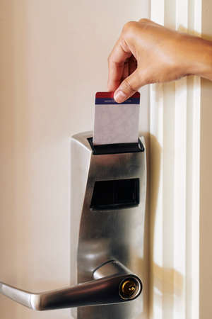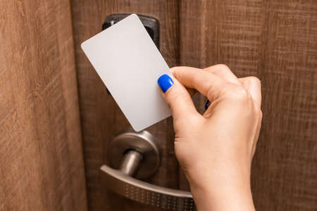 Close-up of female hand holding cardkey and opening the electric lock of the door and check in to the room