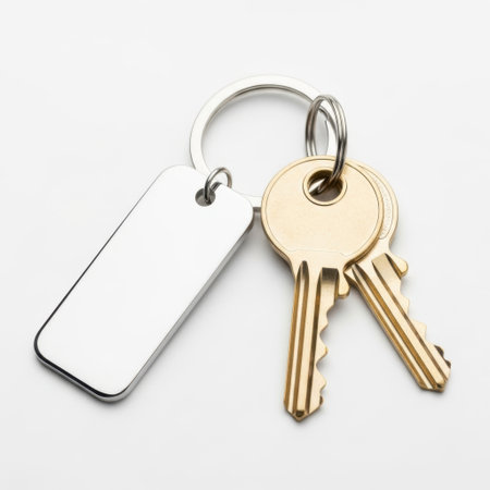 A small house key attached to a decorative keychain is displayed against a neutral background. The keychain features a tiny house design, emphasizing charm and personality.