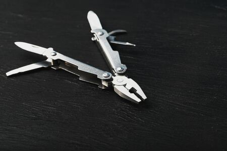 Multitool is a multi-functional tool on a black background. The concept of an expanded multi-tool with free space. Clipping path included isolate