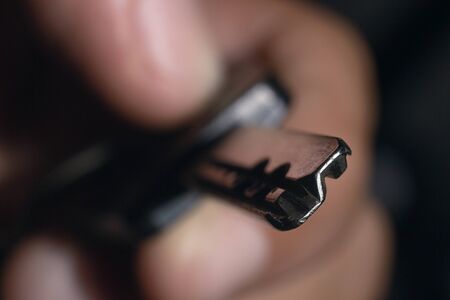 Male hand holding house key. Key in a hand. Unprotected data. Closeup key. Selective focus and shallow Depth of field.