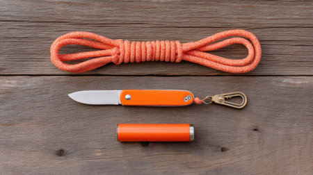 This image features a bright orange knife, rope, and flashlight on a rustic wooden surface, perfect for showcasing outdoor gear for adventure enthusiasts.