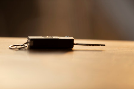 Car key on a wooden table, close-up, selective focus
