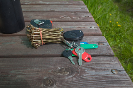 a bunch of golden long screws and car keys and cottages on a wooden table. natural light
