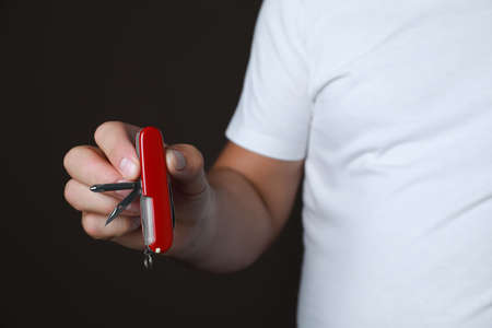 Swiss army folding knife in the forest. Close-up.