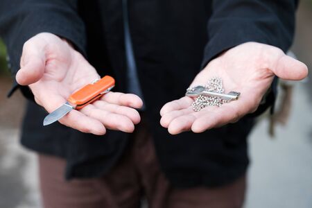 the man holds out a key or a penknife to choose from