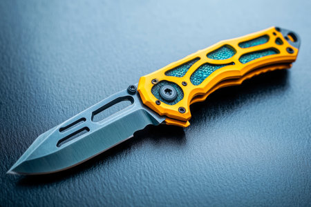 Close-Up Shot of a Modern Pocket Knife Yellow and Black Aluminum Handle on a Dark Blue Background