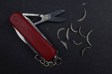 A red multi-tool knife with scissors, surrounded by small metal shavings on a dark background