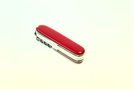 A close up view of a red pocket knife over white