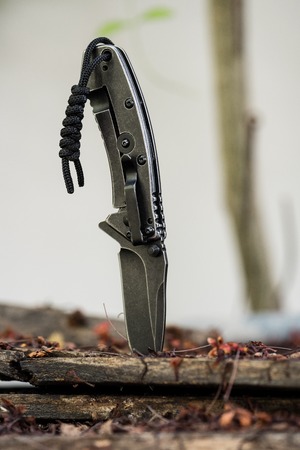 Folding knife for survival is stuck in stump sawn tree against background pine forest