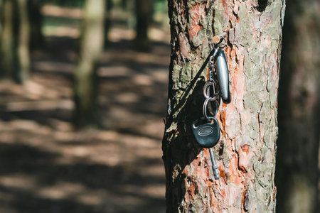 Lost car keys hanging on a tree in the forest