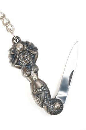 Pocket knife with mermaid shaped on white background, made from brass.