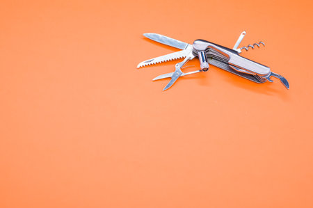 A high angle shot of a swiss army knife on an orange surface