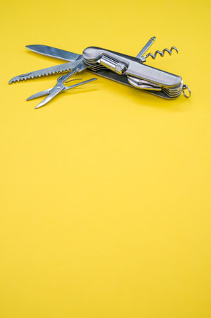 A vertical shot of a swiss army knife on a yellow surface