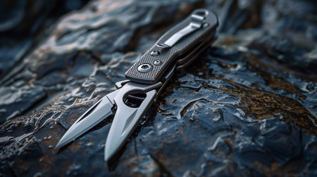Close-up of a multi-tool highlighting its blades and sturdy texture against a wet rock backdrop