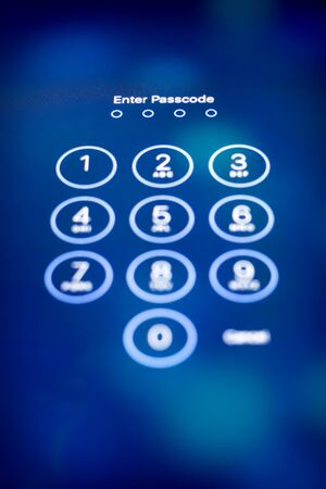 Secure password on keyboard for opening office. Password code Security keypad system protected in Public Building. The security code combination to unlock the door