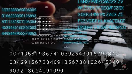 Man working on laptop computer keyboard with graphic user interface GUI hologram showing concepts of big data science technology, digital network connection and computer programming algorithm.
