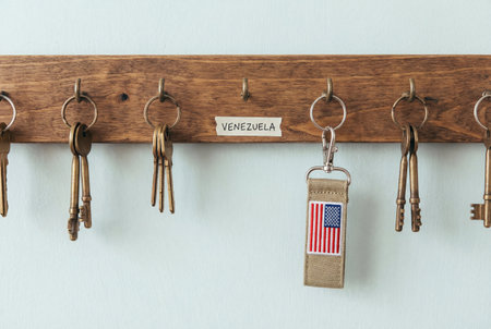 A wooden key rack mounted on a wall features various metal keys and an empty hook labeled venezuela next to a keychain with an embroidered american flag showing a migration concept.