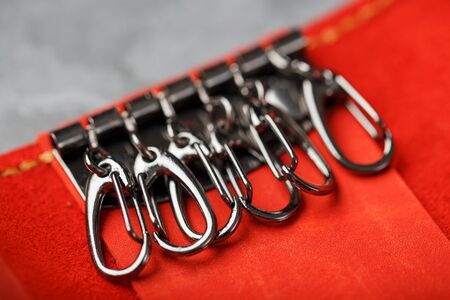 Handmade key holder made of genuine red leather on a dark background. Close-up