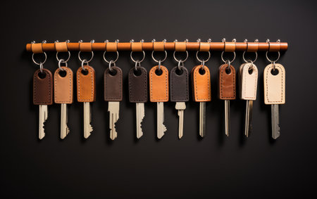 Rack with keys hanging on brick wall