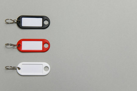 Three key holders with blank labels on gray background, flat lay. Space for text