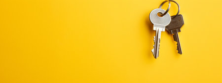 The concept of buying real estate, minimalistic yellow background with key form house. Rental housing, purchase or sale. Banner with copy space. Generative AI