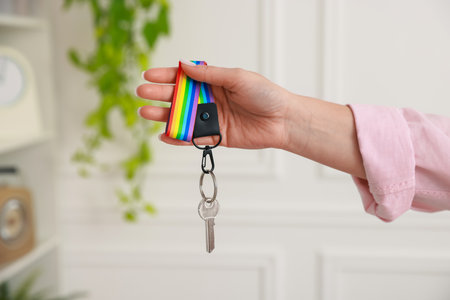 Woman holding key with keychain in LGBT colors indoors, closeup