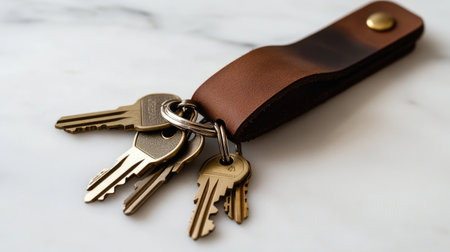 A close-up of a leather keychain adorned with vintage keys, elegantly placed on a marble surface. This image captures texture and style, perfect for lifestyle and accessory themes.