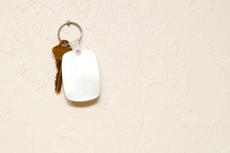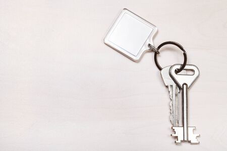 bundle of keys on keyring with blank white keychain on pale brown table