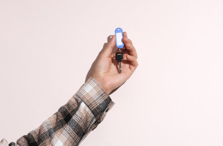 Man's hand in shirt holding key with tag on beige background with shadow