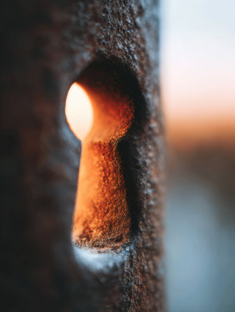 A worn keyhole reveals a soft light streaming through at sunset, casting an inviting glow in the dim surroundings of an aged stone wall.