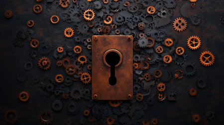 Vintage rusty keyhole and cogs on textured background.