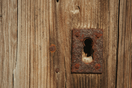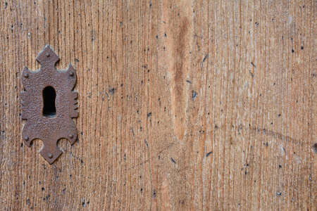 keyhole, closed old textured wooden door with rusty key lock hole. old wooden background or surface with copy space. door of a house or building with selective focus