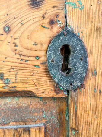 Old keyhole in a wooden door. Close-up shot.