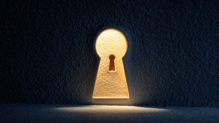 Glowing keyhole illuminates textured wall, creating sense of mystery and intrigue. warm light highlights shape of keyhole, inviting curiosity about what lies beyond