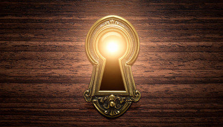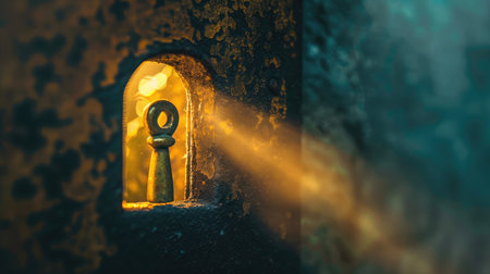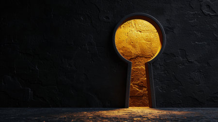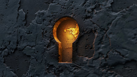 Keyhole illuminated by warm golden light against textured dark wall creates mysterious and inviting atmosphere. This evokes curiosity and allure of discovery